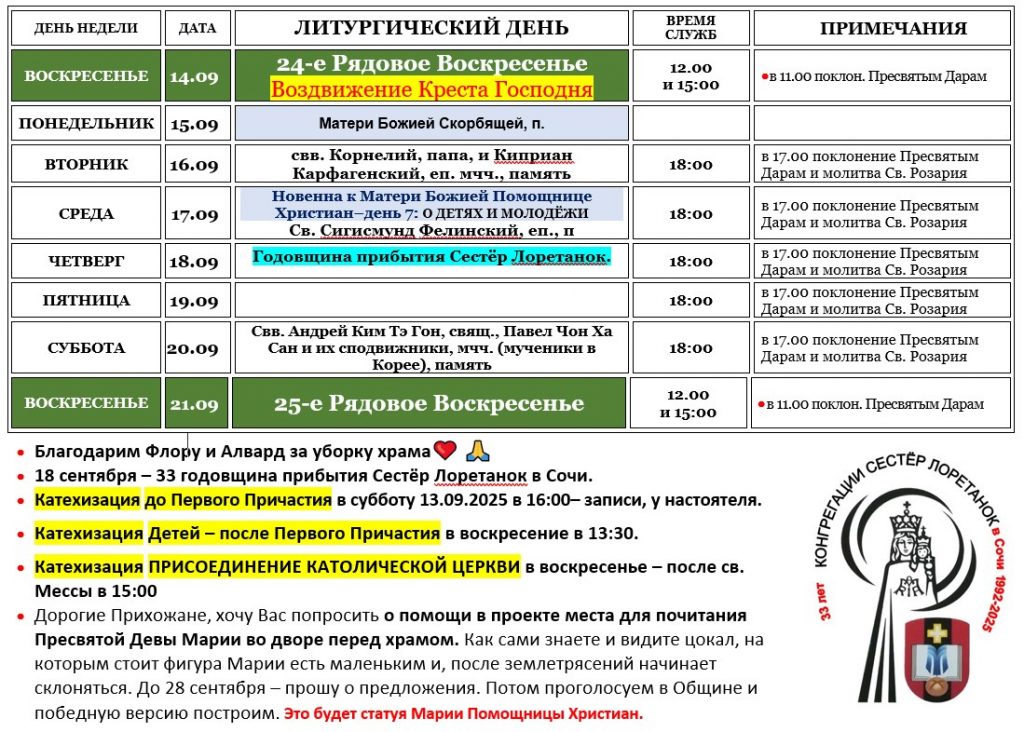 * 12:00 и 15:00 – БОЖЕСТВЕННАЯ ЛИТУРГИЯ на Русском Языке в Сочи