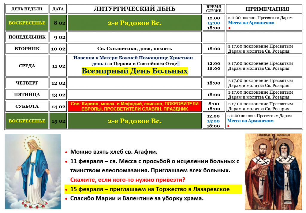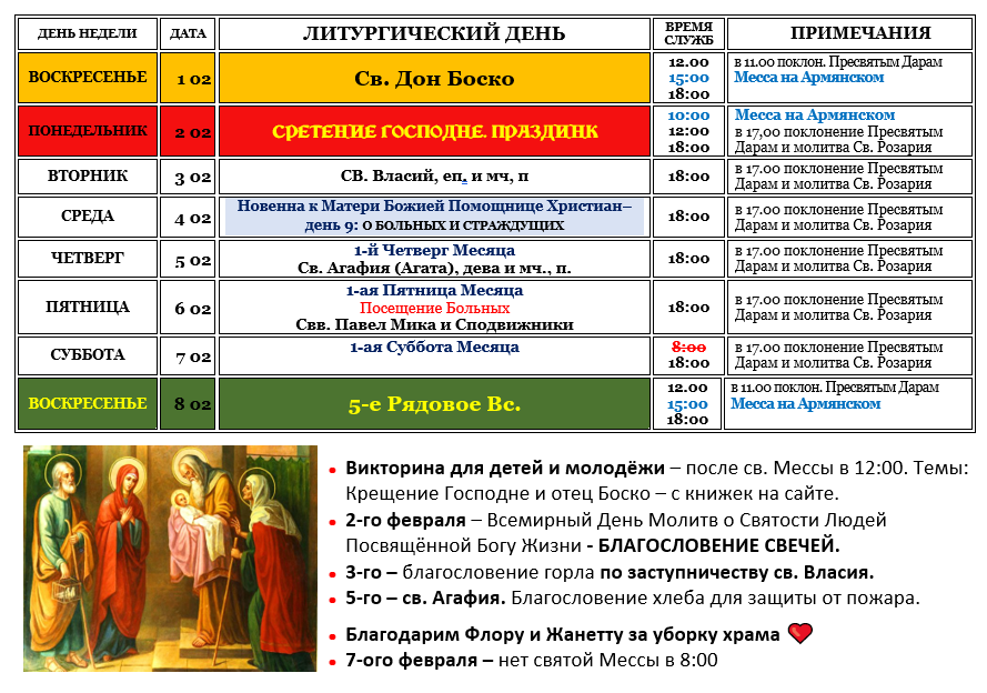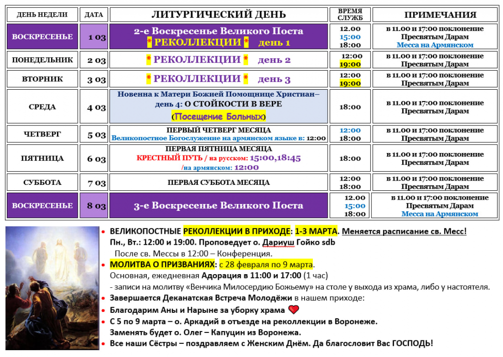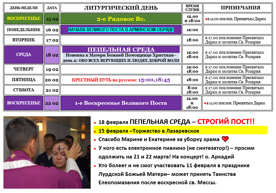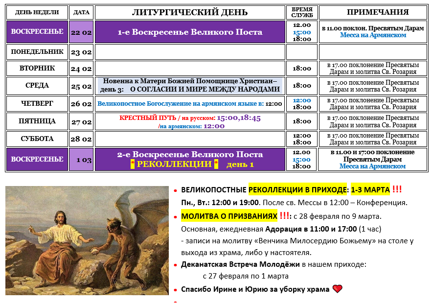 (во время Великого Поста) * 12:00 – Крестный Путь