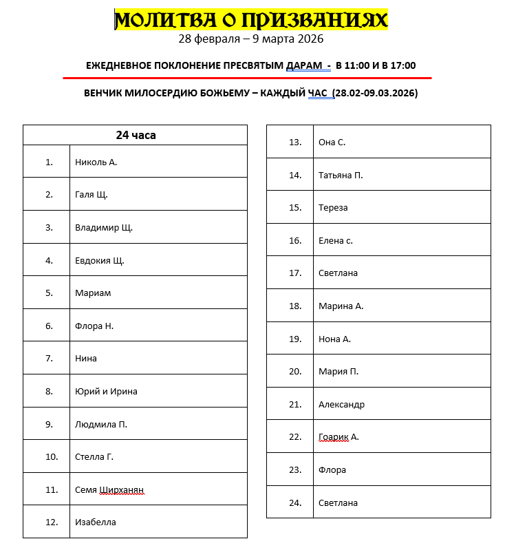 Прошу Вас включится, по мере возможности, в часовое ПОКЛОНЕНИЕ СВЯТЫМ ДАРАМ в 11:00 и 17:00 (ежедневно с 28 февраля по 9 марта).